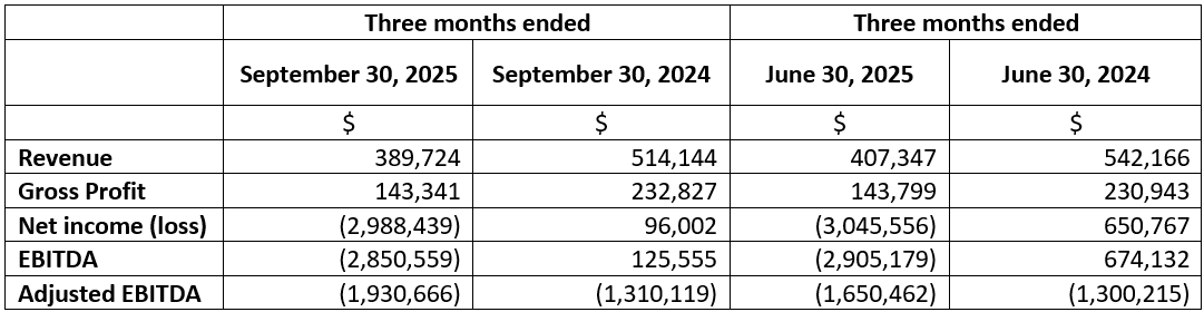Revenue for the third quarter of 2025 decreased to $389,724 in comparison to second quarter 2025 revenue of $407,347 and Q3/2024 revenue of $514,144. Adjusted EBIDTA loss for the third quarter of 2025 increased in comparison to the second quarter of 2025 primarily due to the increase in salaries and wages from new hires in preparation for the restart of the lease originations.
